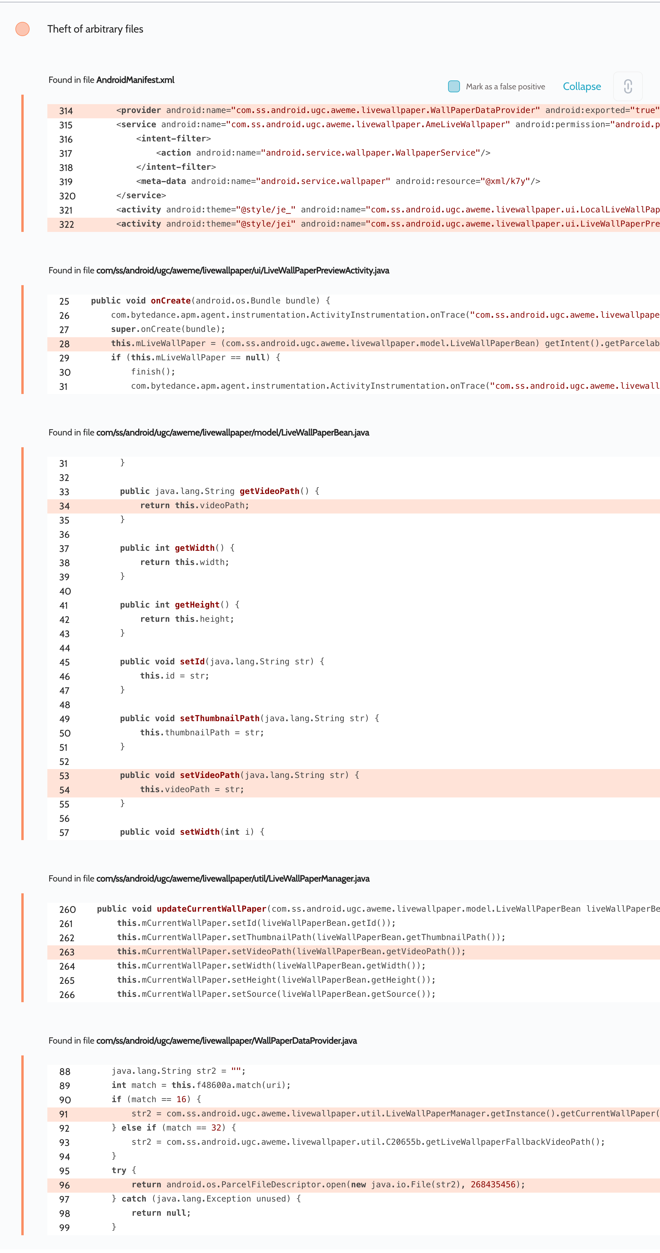 首先com.ss.android.ugc.aweme.livewallpaper.ui.LiveWallPaperPreviewActivity 是导出的Activity,可以接受用户指定的文件并将其设置为墙纸. 用到的关键数据结构是com.ss.android.ugc.aweme.livewallpaper.model.LiveWallPaperBean,墙纸的路径是live_wall_paper. 这个值被保存在了LiveWallPaperManager中. 然后是另一个导出的Provider WallPaperDataProvider,可以通过content://com.zhiliaoapp.musically.wallpapercaller/video_path来读取当前的墙纸.