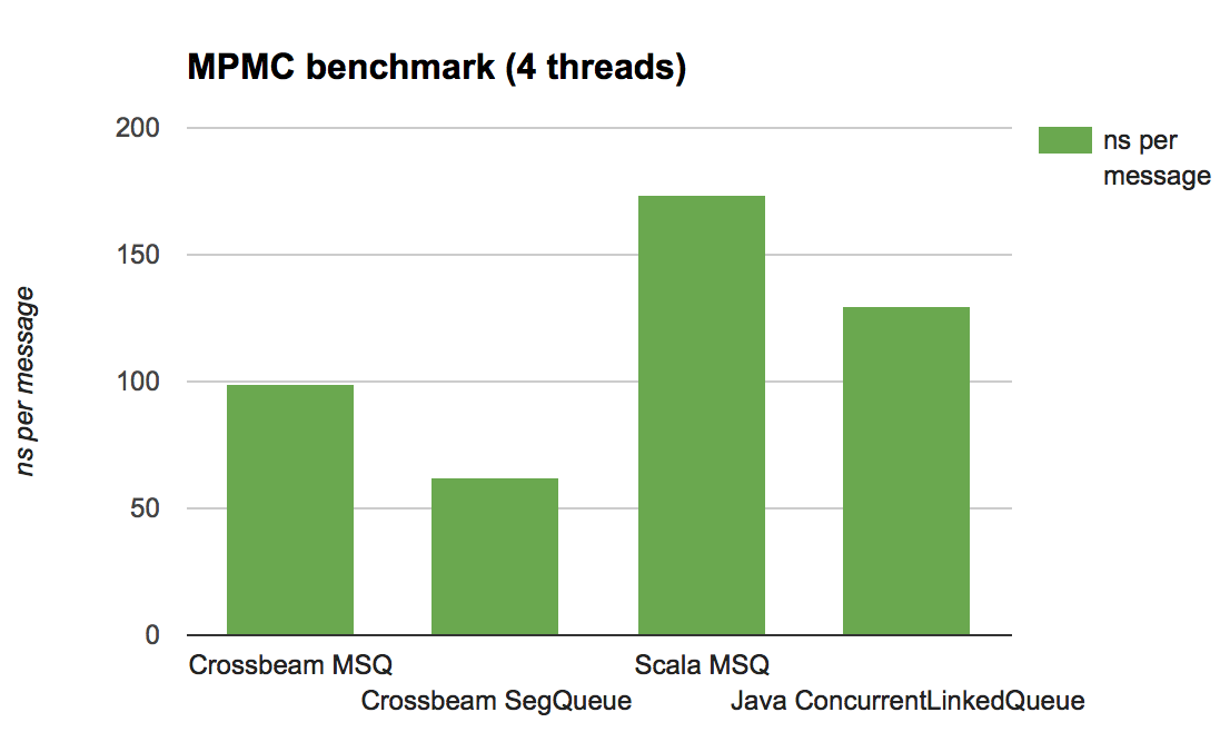 这样的基准测试对于测量“竞争”(多线程竞争同时进行并发更新)下无锁数据结构的可伸缩性相当典型。 在构建生产队列实现时,应该对许多变体进行基准测试; 这里的目标仅仅是评估内存管理方案的大致开销。